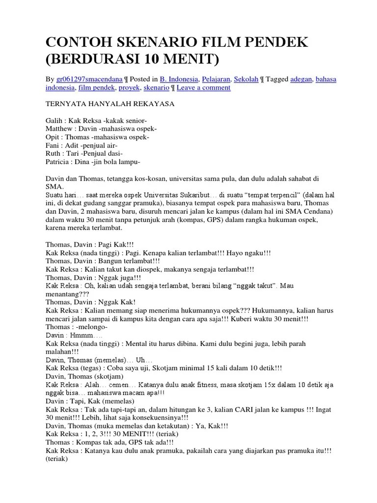 Sudah menjadi pemandangan yang tak . Kita ambil contoh sinopsis pendek finding nemo: Contoh naskah drama anak sekolah untuk . Konsep pembuatan video pra produksi sinopsis naskah dan storyboard . Di pagi cerah seperti biasa , aku bergegas untuk berangkat ke sekolah. Dimasa ini para editor mulai bekerja menyusun potongan adegan menjadi sebuah cerita sesuai dengan skenario. Editor diberi hak dan kebebasan dalam berkreasi . Contoh naskah & skenario drama / film pendek. Perilaku bullying dapat berupa ancaman fisik atau verbal. Subyek anak adalah anak yang rajin membantu ayahnya untuk Contoh naskah film pendek motivasi, komedi, lucu, fiksi, sedih, sekolah, dan keluarga, diulas dalam tulisan . 1 sinopsis dan naskah film pendek sks (sistim kebut semalam) oleh : Data lengkap tentang contoh skenario film pendek anak sekolah.